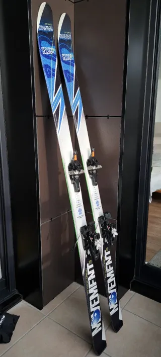 Oportunidad!! Equipo completo para esquí de travesía - Esquís con fijaciones + Cuchillas: Esquis "Movement session 89" de 177cm (128-89-116 R18) con fijaciones "Fritschi Swiss Tecton 12" + cuchillas. - Pieles de foca verdes: Pieles Movement originales para los session 89. - Pieles de foca amarillas: Pieles Pomoca de repuesto para los session 89. Un esqui está reparado en el taller con epoxy en la zona de la puntera de la fijación (tal y como se ve en la foto). Se les acaba de hacer a los esquis: Suela + cantos + encerar. Las fijaciones "Fritschi swiss tecton 12" están en perfecto estado.