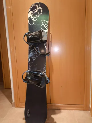 Vendo tabla de snow usada con sus fijaciones. Está en buenas condiciones, aunque presenta algunos arañazos superficiales. - Incluye una tabla de snow y unas fijaciones. - La tabla es de color negro y las fijaciones son de color beige. - Se aprecian algunos signos de uso.
