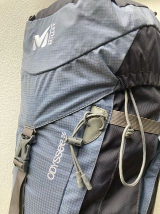 - Mochila Millet Odyssee 35. - Cuerpo principal con 2 compartimentos individuales. - Hueco para bolsa de hidratación. - Extensible lateralmente. - Correas de compresión y de fijación para piolet, bastones, etc... - Espalda rígida y ventilada. -Capacidad 35 litros. - Funda para la lluvia. - Muy buen estado.