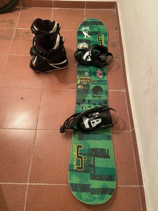 Conjunto completo para snowboard. - Tabla de snowboard verde con diseño. - Fijaciones negras y blancas. - Botas de snowboard negras.