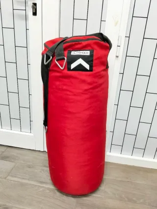 Saco de boxeo de la marca Decathlon. El saco de boxeo ideal para iniciarse en el boxeo inglés. La tela muy resistente y las correas de fijación favorecen el aprendizaje del boxeo en las mejores condiciones. El saco de boxeo lleno mide 76 cm. En función del relleno, el saco se abomba por arriba y por abajo. Las correas unidas al saco (no ajustables) tienen una longitud de 31 cm, medidas verticalmente de arriba a abajo. En total: el saco mide 105 cm (medida del saco fijado en el techo, de arriba a abajo). El saco de boxeo 100 se vende relleno con recortes de tela. Utilizamos residuos de la producción textil para llenar el saco. Est