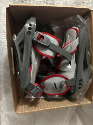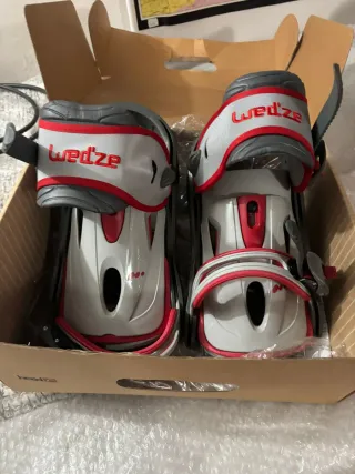 Fijaciones para snowboard de la marca Wed'ze. Diseñadas para ofrecer comodidad y sujeción. - Correas ajustables. - Base robusta. - Diseño en gris, blanco y rojo.