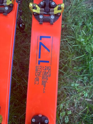 Esquís de montaña Dynafit con fijaciones. - Color naranja vibrante. - Fijaciones de esquí de montaña. - Modelo 171. Usado una sola vez, en perfecto estado, se vende por falta de uso.