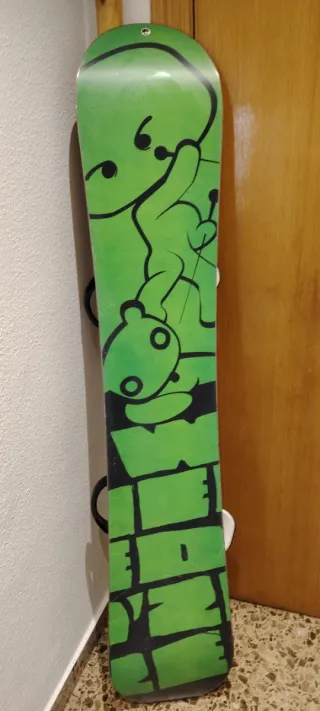 Tabla de snowboard con un diseño llamativo en color verde y dibujos en negro. - Diseño gráfico original. - Base de color negro con detalles. - Forma simétrica. 160 cm Incluye fijaciones, botas guantes con protección. Varios protectores de rodilla codos y muñecas. Casco con recambios de interior, 2 gafas, culote con protecciónes. Todo lo que se ve en las fotos