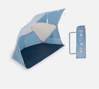 Protector solar para la playa con diseño compacto y fácil de transportar. Ofrece una alta protección contra los rayos UV. - Color azul y blanco. - Incluye bolsa de transporte. El refugio de playa se abre tirando de la anilla presente en la parte posterior y se cierra con un solo gesto pulsando el botón de cierre. Dispone de dos medios de fijación al suelo: 1) Piquetas que permiten fijar la sombrilla en la arena o en la tierra. 2) Bolsillos de arena que garantizan una buena sujeción, sin necesidad de utilizar piquetas. No usar en rachas mayores a 30Km/h