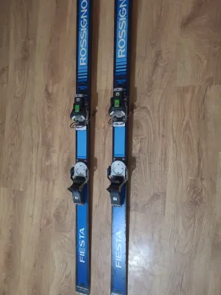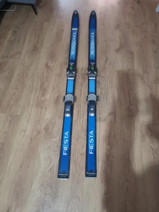 Esquís Rossignol modelo Fiesta. - Color azul con detalles en negro. - Fijaciones incluidas. - Diseño con texto Rossignol y Fiesta.