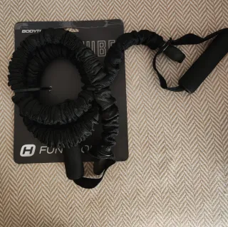 Banda elástica de deporte en color negro. - Mangos acolchados para mayor comodidad. - Funda protectora de tela para la banda elástica.