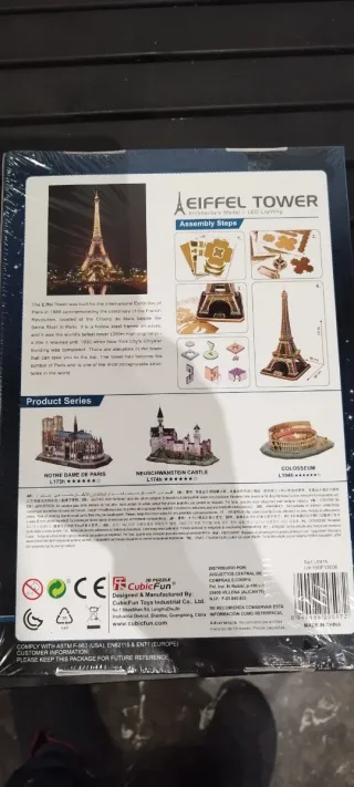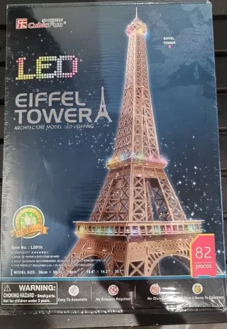 Puzzle 3D de la Torre Eiffel con iluminación LED de CubicFun. Incluye 82 piezas. - Modelo: L091h - Material: Papel y tablero de espuma EPS - Tamaño del modelo: 39cm x 36cm x 78cm - Requiere 2 pilas AA de 1.5V (no incluidas) - Fácil de montar, no requiere tijeras ni pegamento. - Tiempo estimado de construcción: Menos de 4 horas.