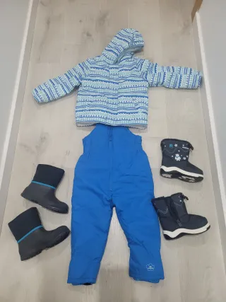 Conjunto de nieve para niño, ideal para mantenerlos abrigados y secos en sus aventuras invernales. - Chaqueta con estampado geométrico en tonos azules y blancos. - Peto de esquí azul. - Dos pares de botas de agua/nieve negras con detalles azules y cremallera. Talla 26 y la otra 30. Usado solo 1 vez.