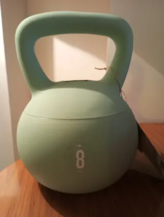 Pesa rusa tipo kettlebell en color verde, con un peso de 8 kg. - Diseño ergonómico para un agarre cómodo. - Marcaje de peso visible en la superficie.
