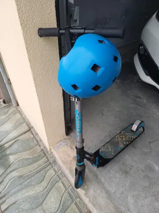 Patinete de la marca Decathlon,plegable y regulable en altura, modelo Oxelo, en color azul.Con freno - Ruedas de color azul. - Plataforma con diseño gráfico. - Manillar ajustable. _ Casco incluido en el precio