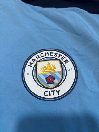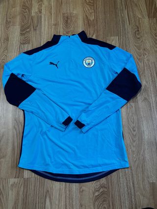 Camiseta de entrenamiento del Manchester City con tecnología Drycell de Puma. La camiseta luce como nueva pero tiene una mancha en una de las mangas. ( ver foto) - Color azul - Manga larga - Cuello alto con media cremallera - Logo de Puma y escudo del Manchester City