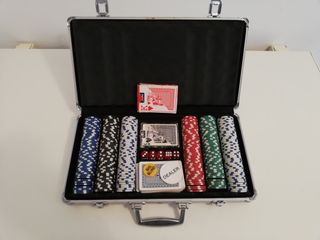 Completo set de poker con maletín de aluminio para guardarlo todo. - Maletín de aluminio. - Fichas de póker de varios colores. - 3 barajas Cartas de póker. - Dados. - Marcador Dealer y Big Blind.