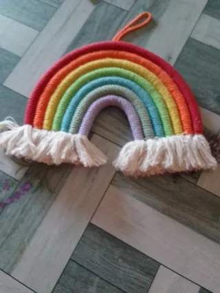 Precioso arcoíris decorativo hecho a mano con lana. - Diseño de arcoíris con múltiples colores. - Adornado con flecos de algodón en la base. - Incluye un lazo para colgar.