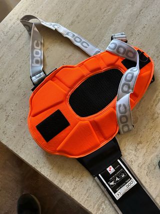 Protector de espalda POC POCITO SPINE para esquí alpino. - Color naranja fluorescente. - Correas ajustables. - Certificación CE.