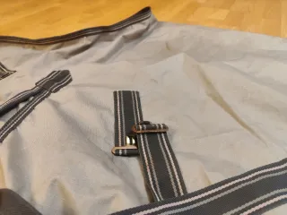 Manta de caballo impermeable de la talla 155, con 200g de relleno. No está lavada y le vendría bien una capa de spray impermeabilizante para reforzar
