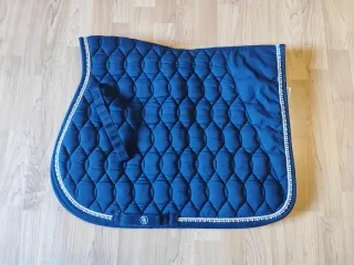 Mantilla de uso general para equitación, ideal para salto o uso general. Diseño acolchado con borde decorativo. - Color azul marino. - Borde con detalle de pedrería. - Cintas de sujeción. - Logo de la marca BR.
