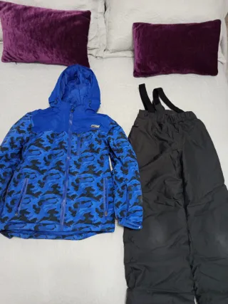 Conjunto de ropa de nieve de la marca Mountain. - Chaqueta azul con estampado de camuflaje. Está en perfecto estado. - Pantalón de peto negro, como nuevo, un pelín de marca de uso en las rodillas. Talla 10