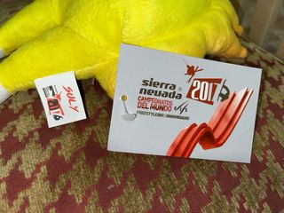 Peluche oficial del Mundial de Snowboard de 2017. - Diseño amarillo con detalles naranjas. - Piernas blancas con pies. - Etiqueta de la marca SULY.