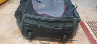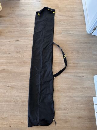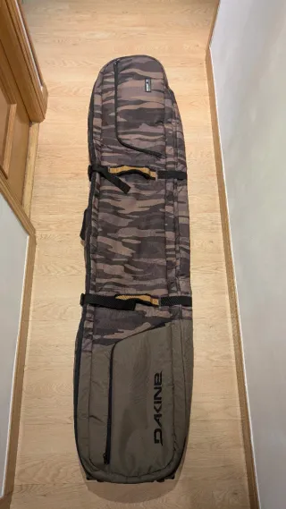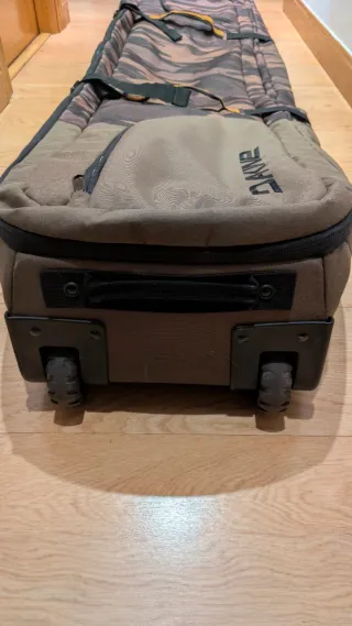 Funda de snowboard con ruedas de gran capacidad en muy buen estado para llevar toda la equipación, incluso 2 tablas (1 con las fijaciones desmontadas) y 2 pares de botas. He viajado también en avión con ella y todo perfecto. Tiene bolsas interiores para organizar botas y ropa, y bolsillos exteriores para accesorios. En la parte frontal tiene un enganche de velcro para abrazar el asa de tu maleta y tirar de las 2 cosas a la vez. Tiene un buen acolchado y aislante.