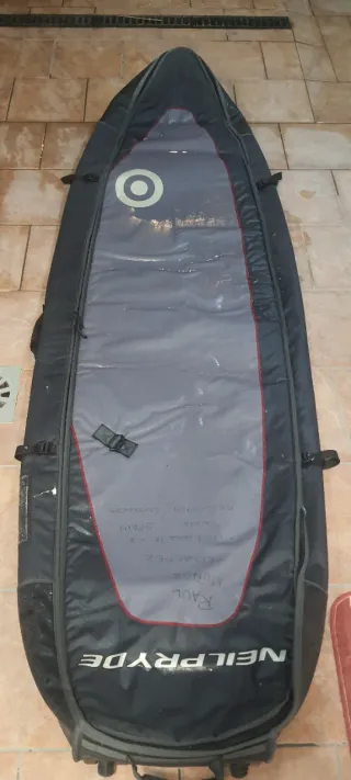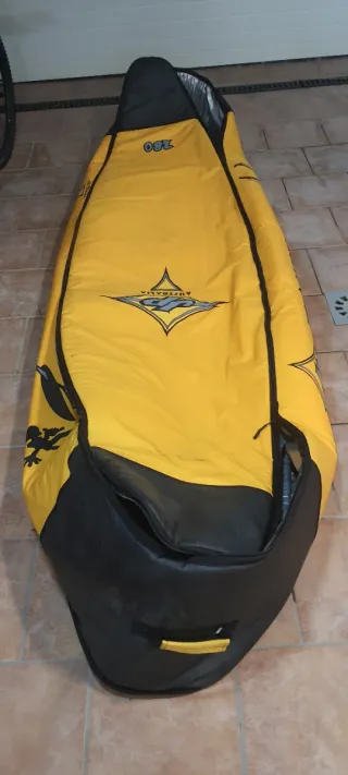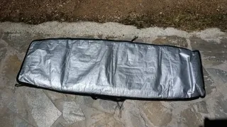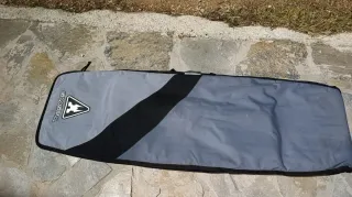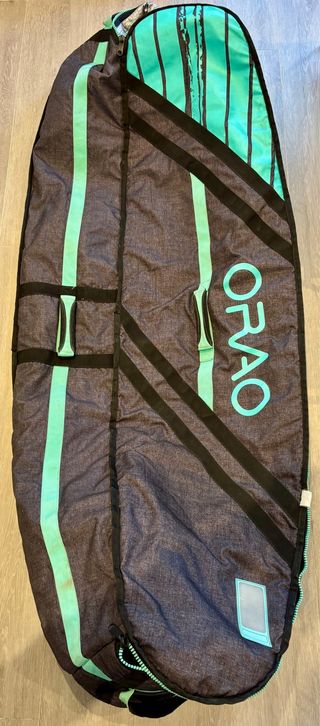Funda de transporte para tablas de kitesurf o surf de la marca Orao de Decathlon. Diseñada para tablas de hasta 6 pies maximo. Caben hasta 2 tablas (twintip y surf) y 3 kites (12 9 y 6 en mi caso) + neoprenos - Material resistente. - Cierre de cremallera. - Asas de transporte. Bolsillos interiores para cera y demas