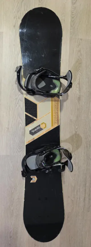Tabla de snowboard Quechua de 155 cm con fijaciones y funda incluida. En buen estado - Fijaciones incluidas. - Gráficos en tonos amarillo, negro y gris.