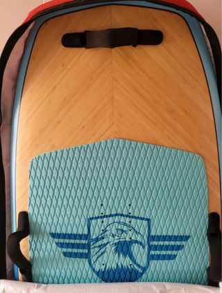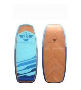Tabla de surf de foil con un tamaño de 5 pies y 2 pulgadas. Presenta un diseño con detalles en madera y un acabado azul con líneas gráficas. Tabla Sup Foil 5'2 Natural y funda. NUEVA. Con funda para guardar. Sin estrenar. A mitad de su precio original, factura última foto casi 900 euros. - Diseño con acabado en madera. - Parte superior con diseño gráfico azul.