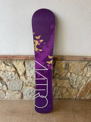 Tabla de snowboard Nitro 149cm con un diseño llamativo en color morado y detalles de mariposas. - Diseño con mariposas y helechos. - Color morado predominante. - Logo de Nitro en blanco. - Usada menos de 10 ocasiones - Solo tabla - Incluye funda