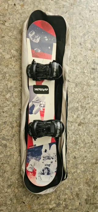 Tabla de snowboard Salomon con fijaciones y funda, la tabla mide 150cm y es tipo sight. Escucho ofertas - Diseño negro y blanco. - Fijaciones incluidas. - Funda incluida.