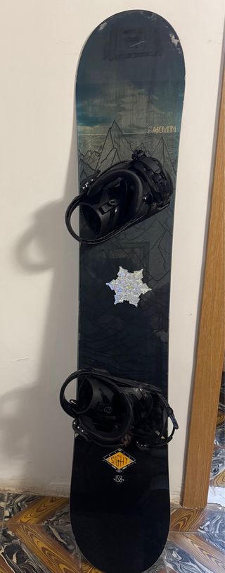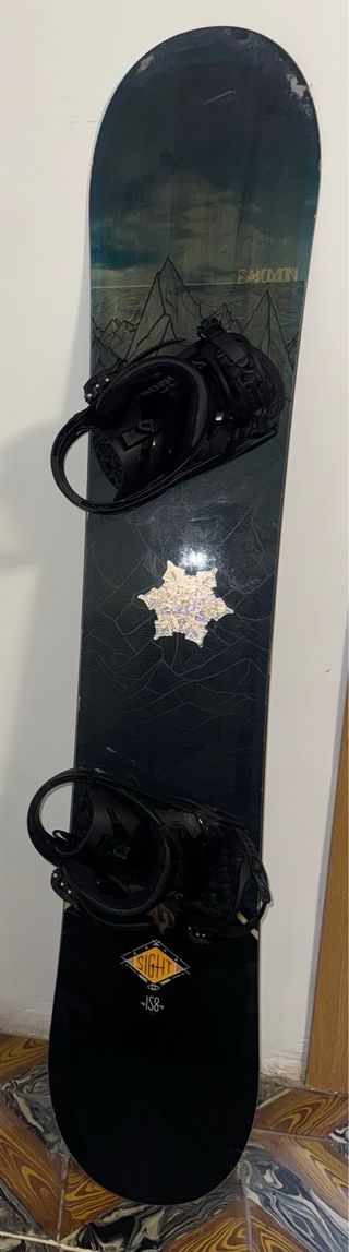 Tabla de snowboard Salomon de 158 cm, ideal para disfrutar de la montaña. Incluye fijaciones. - Diseño con paisaje de montaña. - Detalle de copo de nieve plateado. - Fijaciones SIGHT + RH. talla M/L - Medida: 158. - La tabla se encuentra encerada