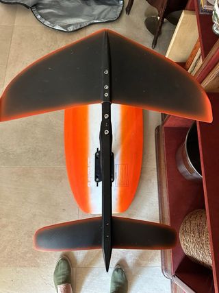 Tabla de wing foil Slingshot con un diseño llamativo en naranja y blanco. Incluye funda. - Diseño en naranja y blanco. - Marca: Slingshot. - Incluye funda de transporte.