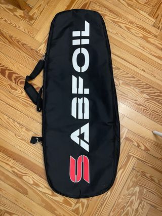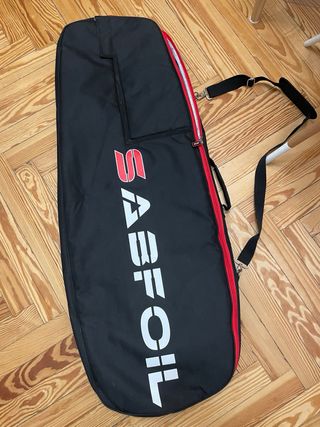 Funda negra para tabla de hydrofoil Sabfoil modelo T65Y. Protege tu equipo de forma segura. Mide 125/130cm de largo por 50cm de ancho. tiene un pequeño corte en la tela que solo implica un pequeño desperfecto estético. por lo demás está prácticamente nueva. La vendo por que mi tabla es de 90cm, mucho más pequeña. - Color negro. - Kitesurf Boardbag - Logo de Sabfoil en blanco y rojo. - Incluye correa para el hombro.
