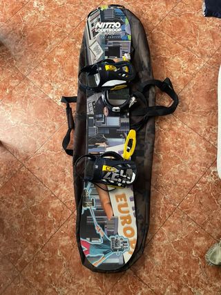 Tabla de snowboard Nitro Looptroop con funda. - Diseño gráfico urbano. - Fijaciones incluidas. - Funda de transporte con correa.