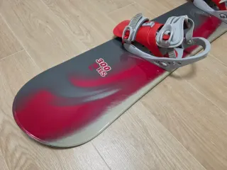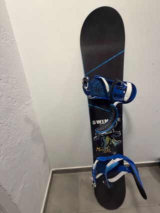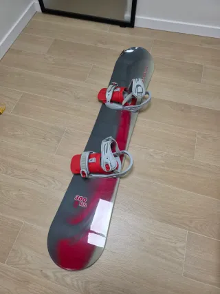 Tabla de snowboard con poco uso pero con golpe en un extremo lateral. No impide ser usada, pero por ello es buena opción como tabla de uso casual o de aprendizaje. Mide 1.50m aproximadamente de largo. Incluye funda de transporte y sujeciones. Se encuentra en zona metro Canillas