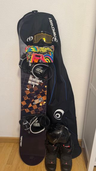 Conjunto completo para disfrutar del snowboard. Incluye tabla, botas, casco y accesorios. - Tabla de snowboard Checked Board 151 cm. - Botas de snowboard HEAD. - Casco de snowboard. HEAD - Gafas de snowboard.BURTON - Funda para tabla de snowboard.
