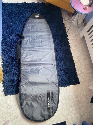 Funda para tabla de surf FK SURF. - Diseño en color gris y negro. - Incluye correa para transporte. - Logo de la marca en la parte superior. - Utilizada un par de veces - Tamaño aprox 6.2