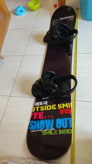 Tabla de snowboard Wed'ze con un diseño llamativo. - Gráficos Snow Outside, Smile Inside. - Fijaciones de snowboard incluidas. - Funda Tiene algún picazo en los bordes. He subido a la nieve 3 veces.