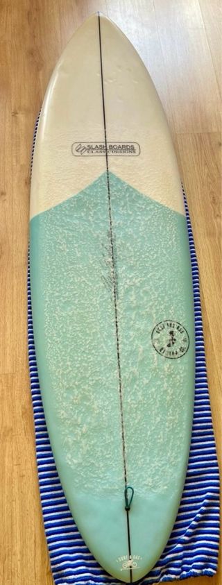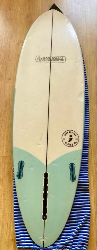 Tabla de surf retro de la marca Slash, modelo 2+1. Se vende con quillas y funda calcetín. - Medidas: 5'11 - Volumen: 33 litros - Configuración de quillas: 2+1 Si se compra con la tabla 6’1” de 31 litros dejo las dos juntas a 200 euros (100 euros cada tabla).