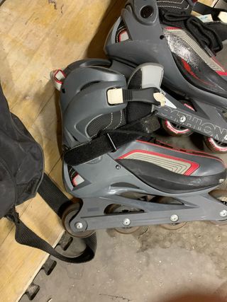 Se venden patines en línea en buen estado, talla 42. Son cómodos y resistentes. - Color gris con detalles en rojo y negro. - Cierre de velcro y hebilla. - Ruedas de poliuretano.