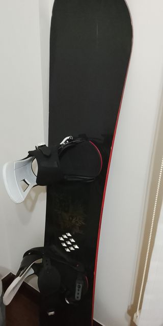 Tabla de snowboard negra con fijaciones incluidas. Lista para la montaña. - Diseño moderno y elegante. - Fijaciones ajustables para mayor comodidad. - Borde rojo distintivo.