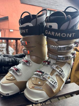 Botas de esquí Garmont Hydra para travesía. - Color blanco y beige. - Cierre con 4 ganchos. - Correa de velcro en la parte superior.