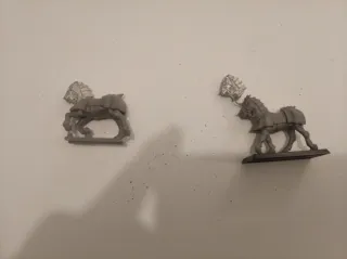 Piezas de metal para montar un carro del caos de Warhammer. Incluye dos figuras de caballos con armadura y un detalle de cabeza.