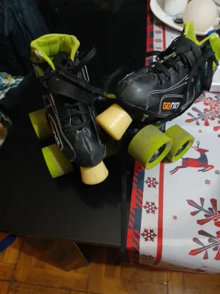 Patines de hockey para empezar a jugar. Son cómodos y seguros. - Color negro con detalles en verde lima. - Ruedas de color verde. - Cierre con cordones.