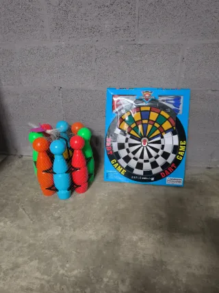 Set de juegos para divertirse en casa o al aire libre. Incluye una diana de dardos y un juego de bolos. Nunca se ha usado, se venden juntos. - Diana con dardos. - Bolos de colores.