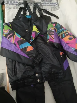 Mono de nieve infantil con un diseño llamativo y colorido. - Tirantes ajustables. - Cremallera frontal. - Bolsillos con cremallera. - Detalles en color morado y estampado abstracto. -La chaqueta tiene un diente de la cremallera roto (no impide su uso) de ahí el precio
