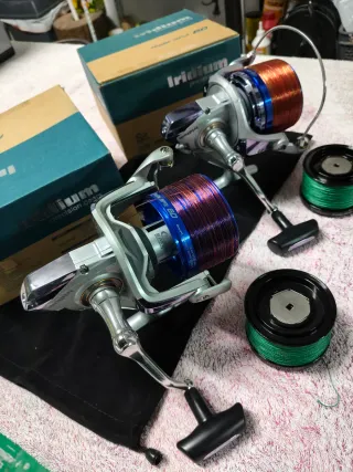 Se venden carretes de pesca Iridium 60,......85€ cada uno ...no negociable..las 4 bobinas son de aluminio ultraligero....ideales para la pesca deportiva. Están nuevos a estrenar nunca se usaron...vendo por exceso de material.no cambio - Diseño plateado y azul. - Bobinas de repuesto con hilo verde. - compatible con Shimano