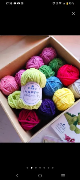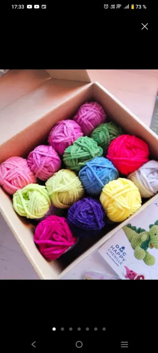 Caja con ovillos de lana para amigurumi, hay 14 ovillos, patrones y un ganchillo 3,5 - Colores variados: rosa, verde, amarillo, azul, morado, fucsia y blanco. - Material suave y agradable al tacto.