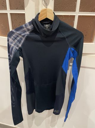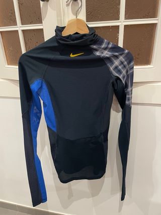 Camiseta técnica Nike para running, de manga larga y cuello alto. Diseñada para ofrecer comodidad y rendimiento. - Tejido transpirable. - Paneles de malla en las mangas y costados. - Diseño con detalles en azul y estampado a cuadros en hombros. - Logo de Nike en amarillo en el pecho.