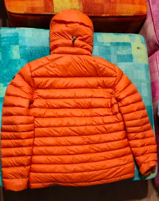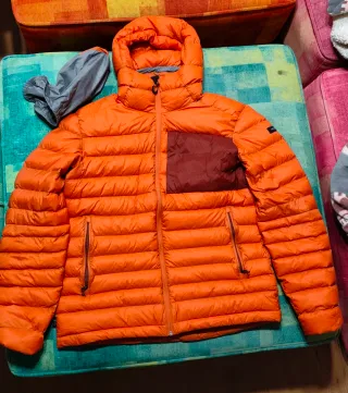 Chaqueta de plumas Forclaz MT500 en color naranja, ideal para montaña y trekking. Diseñada para ofrecer calidez y comodidad. Talla XL - Diseño acolchado. - Bolsillo frontal con panel de contraste. - Cremallera completa. - Capucha integrada. Poco usada, no tiene ningún arañazo, roce o mancha.