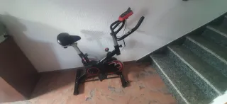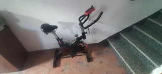 Bicicleta estática para entrenar en casa. - Diseño moderno en color negro y rojo. - Asiento acolchado. - Manillar ajustable. - Pedales con agarre.